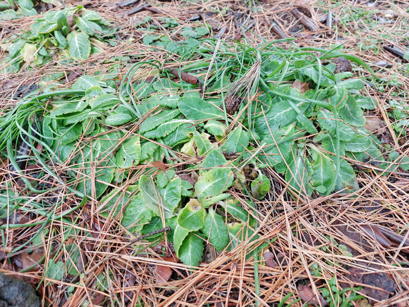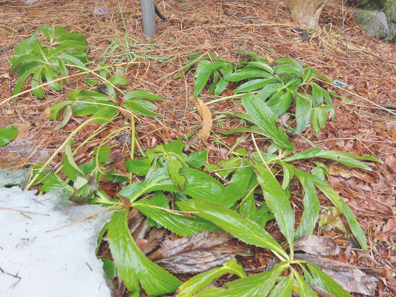 10日ほど前まで1メートルほど積まれていた雪山が、一晩の風雨ですっかり無くなりそこから草花の葉っぱが顔を出していた。