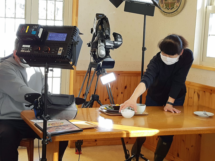 撮影は、インタビューや料理など盛りだくさんでしたが、雪の晴れ間にドローンも飛ばして空からの撮影も。